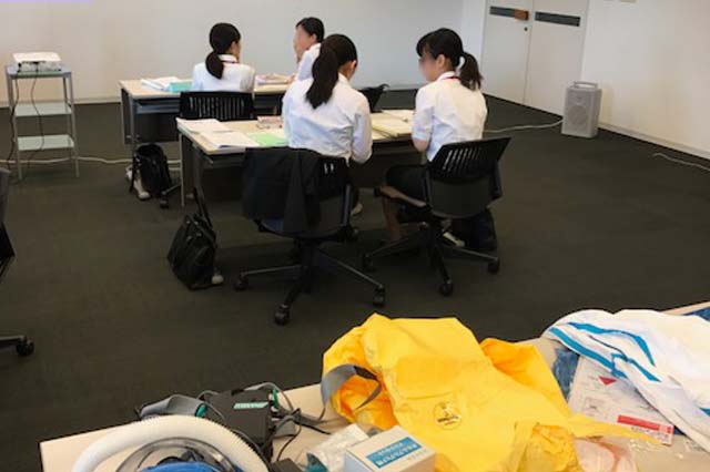 産業保健総合支援センタースタッフのご協力により、産業保健実習を実施いたしました。 労働衛生を学ぶ時間数が限られている中 イメージしていこうと保護具の紹介、職場巡視報告書の紹介